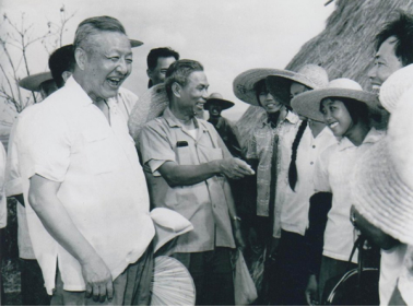 1980年8月底至9月初,习仲勋(左一)在广东湛江农村视察时与青年亲切交谈。