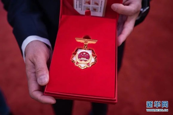4月27日,一名代表展示他荣获的全国五一劳动奖章。图片来源:新华网