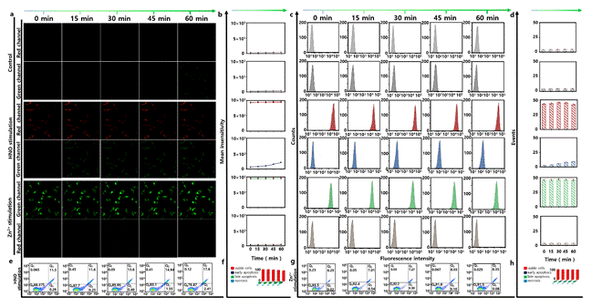 基于探针出色的检测性质,应用探针评估不同组海马神经元细胞(HT22)内Zn2+与HNO之间的相互调控以及利用流式细胞仪评估和分析不同组细胞的凋亡。正常条件下几乎检测不到细胞内HNO和游离Zn2+,而在HNO刺激下,探针Cyto-JN的红色荧光显示出细胞中HNO的水平,而探针CHP-H逐渐增强的绿色荧光结果证实了细胞内HNO的增加可以诱导细胞中Zn2+池中释放出游离的Zn2+;同时细胞的凋亡率呈逐渐增加的凋亡趋势,证实过量的HNO可以诱导细胞凋亡。然而高水平的外源性Zn2+却不能刺激细胞内HNO的产生。因此,Zn2+与HNO在活细胞中的相互调控是单向的即HNO水平的升高会促进Zn2+从细胞内的Zn2+池中释放,但细胞内游离Zn2+的升高并不能调节HNO的生成。