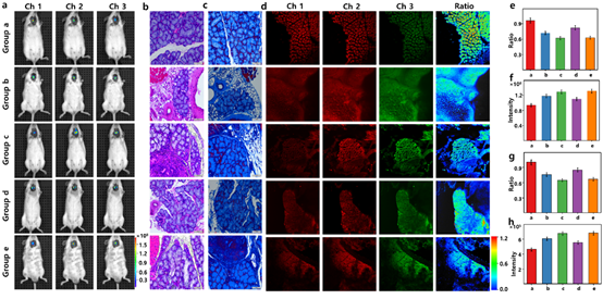 将探针Mito-Cy-Sec用于不同甲状腺疾病的诊断,小鼠组织和活体荧光成像结果表明,不同甲状腺疾病中Sec的含量不同。此外,该实验也证明了在Sec的含量与H2O2的浓度呈负相关关系。这一工作证明了该探针可用于实时监测Sec的变化,并可用于甲状腺疾病的诊断。