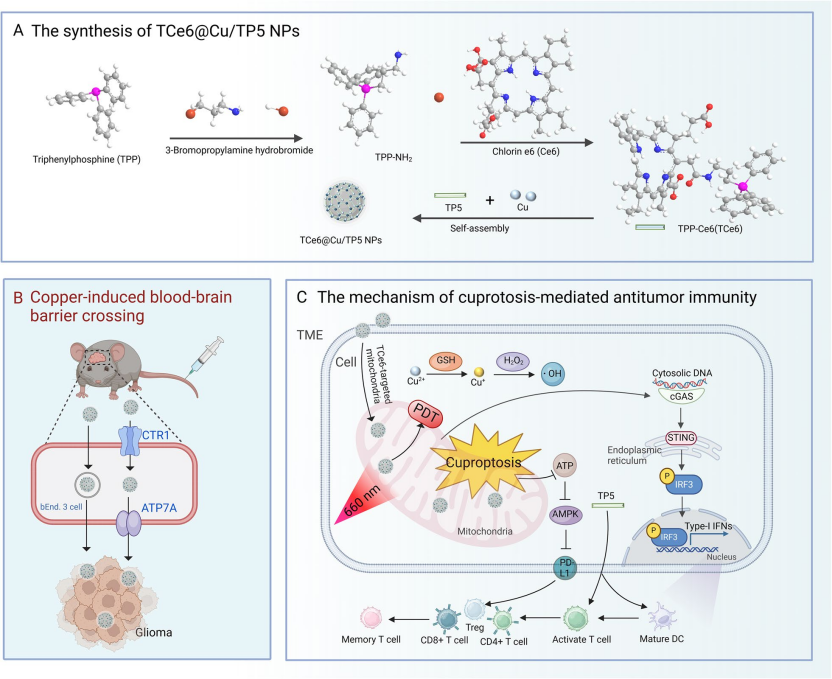 该研究设计了一种铜配位驱动的脑靶向纳米制剂(TCe6@Cu/TP5 NPs),通过线粒体靶向的三苯基磷(TPP)与光敏剂二氢卟吩e6(Ce6)连接形成TPP-Ce6(TCe6),并结合铜离子和胸腺五肽(TP5),实现了该纳米粒制剂的特定部位递送和高效免疫治疗。TCe6@Cu/TP5 NPs能有效跨越血脑屏障并蓄积在脑肿瘤中发挥治疗作用。通过TCe6介导的光动力疗法(PDT)产生活性氧(ROS)并积累,同时结合铜离子诱导的铜死亡(cuproptosis),