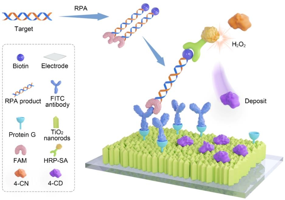 核酸检测对于病原体诊断至关重要,但传统方法通常面临灵敏度低、反应时间长以及对温度要求严格等挑战。本研究开发了一种新型光电化学(PEC)生物传感器,将重组酶聚合酶扩增(RPA)与三维阵列二氧化钛(TiO2)纳米棒电极相结合,有效解决了对核酸扩增产物进行灵敏检测的难题,从而实现更早期、更可靠的病原体检测。该生物传感器采用FITC抗体、靶标核酸和辣根过氧化物酶-链霉亲和素(HRP-SA)三明治结构的三重结合模式,显著提升了电极表面的生物功能化能力。等温RPA反应在37°C下20分钟内完成DNA扩增,而TiO2纳米棒保证了高效的光电转换。4-氯-1-萘酚(4-CN)氧化生成可降低电流信号的苯基-4-氯己二烯酮(4-CD),从而实现了精确灵敏的检测。该生物传感器成功检测到恙虫病东方体(Ot)核酸,检测限为15 copies/μL,检测时间在60分钟内,表现出卓越的性能。本研究为推动病原体核酸诊断平台的发展提供了一种有前景的策略,同时提出了一种适用于多种病原体检测的通用方法。