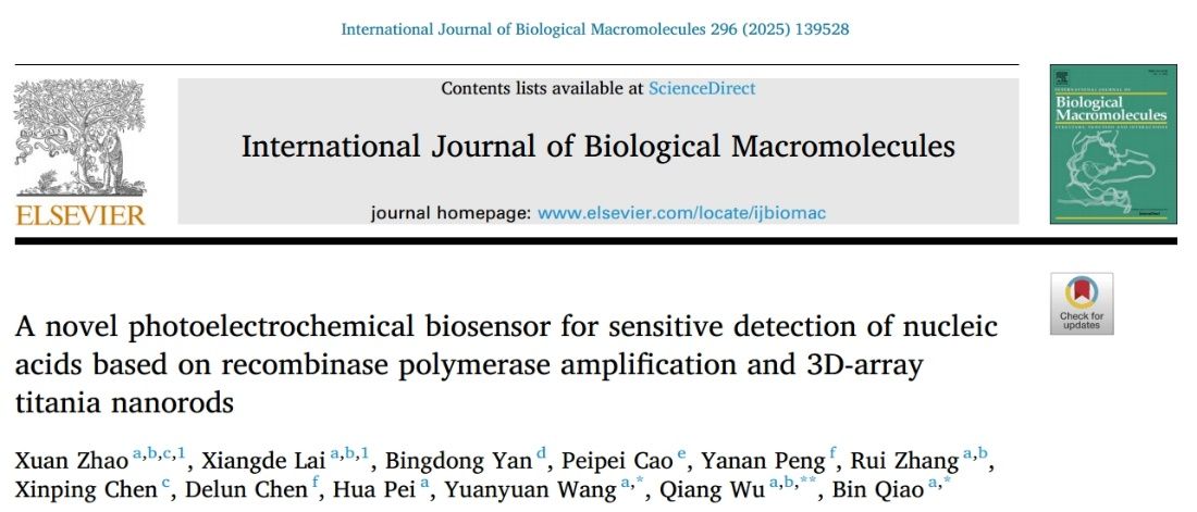 2025年1月13日,热带医学院、急救与创伤研究教育部重点实验室邬强团队在《International Journal of Biological Macromolecules》上发表了题为“A novel photoelectrochemical biosensor for sensitive detection of nucleic acids based on recombinase polymerase amplification and 3D-array titania nanorods”的研究成果。