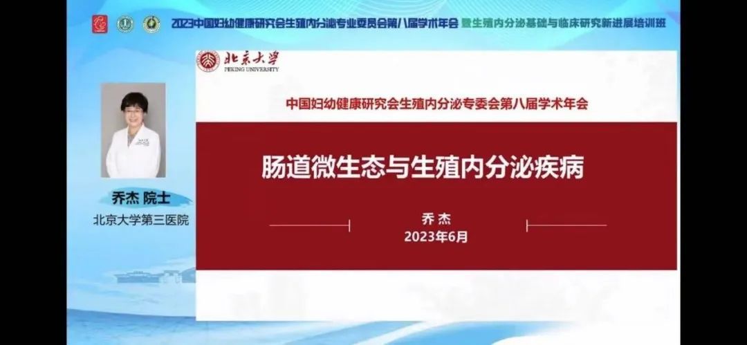 北京大学第三医院乔杰院士带来了以“肠道微生态与生殖内分泌疾病”为题的报告。首先,乔院士以育龄人口规模下降,生育力堪忧问题切入,介绍了育龄期女性不孕的常见原因,解析了肠道菌群生殖内分泌疾病发病的新机制。随后,乔院士简述了多囊卵巢综合征(PCOS)和卵巢功能不全、卵巢早衰(POI)患者的临床表现、发病机制以及肠道菌群的变化,指出了免疫因子IL-22、GLP-1受体激动剂和靶向菌源DPP4在改善PCOS临床治疗中的作用,为生殖内分泌疾病的早期前性评价和治疗提供潜在可预测的靶标及候选化合物。最后,乔院士提出了展望:搭建生殖内分泌疾病肠治转化平台,从肠道健康角度促进女性生育力。