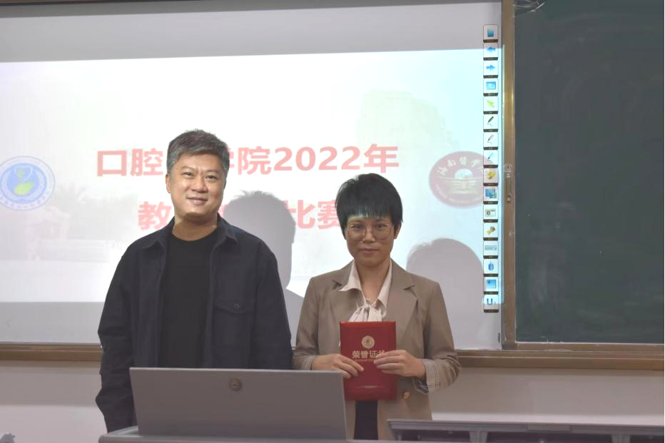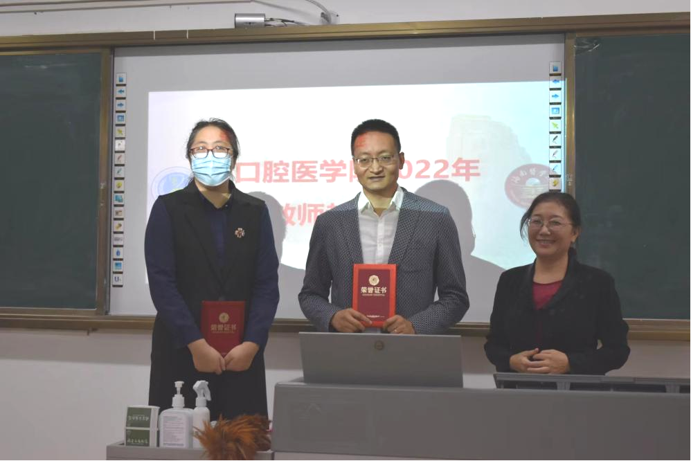 (副处级辅导员李萌杰为口腔正畸教研室颁发优秀组织奖证书)