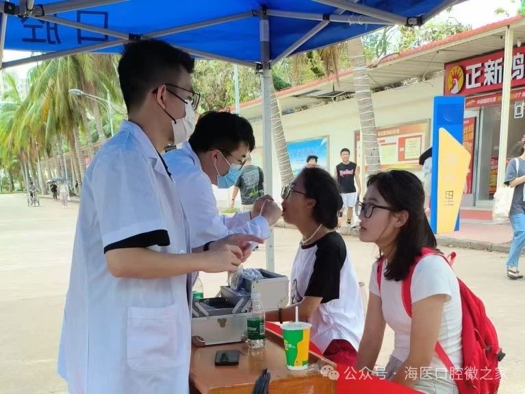 活动当日中午,口腔医学院的老师和在读的研究生学长学姐们正为前来的同学们进行口腔义诊。他们用专业的知识与无私奉献的医学素养细心地为前来咨询的在校职工与同学检查口腔,并给出有针对性的建议。太阳的炙热没有减少志愿者们参与活动的一丝热情。除了义诊,其他志愿者们也满怀热情地向过往的学生宣传口腔健康知识。他们一边分发传单,一边用轻松、幽默的话语把口腔知识输入每个参与者的心中,推动着活动的顺利进行。不少同学表示,通过参与这次活动,他们重新重视起口腔健康的重要性。还有的同学认为这次活动使他们对口腔有了更深的了解。