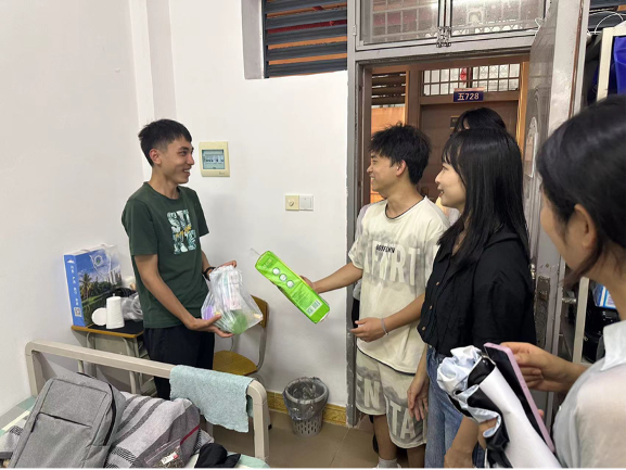 27日晚,黄娇老师、符颖老师和院级学生组织负责人深入学生宿舍,了解新生住宿情况、适应情况,协助新生解决住宿相关问题,同时为各宿舍派发学院贴心准备的生活用品大礼包。大小齐备的纸巾、日常洗手杀菌的洗手液、为宿舍带来清新的芳香剂以及夏天必不可少的“神器”花露水,这些极具实用性的生活用品既体现了学院领导、老师们对新生的关怀与关心,也为24级新同学们的大学新生活增添一份温暖与祝福。