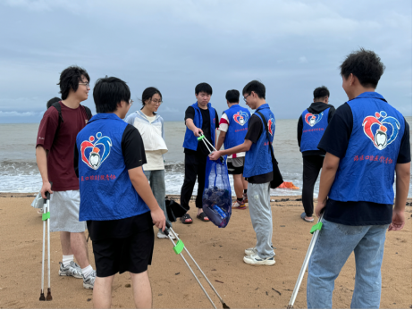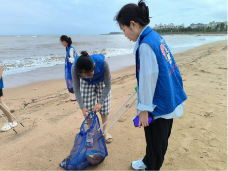 身穿蓝色志愿者服的同学们,有的拿着垃圾钳,有的提着垃圾袋,浩浩荡荡来到海滩。清理海滩上散落的塑料瓶、包装袋等垃圾。我们缘着海滩一路清扫,垃圾袋渐渐被塞满。原本一片狼藉的海滩,只余下些许脚印。这便是我们来到这里的意义。