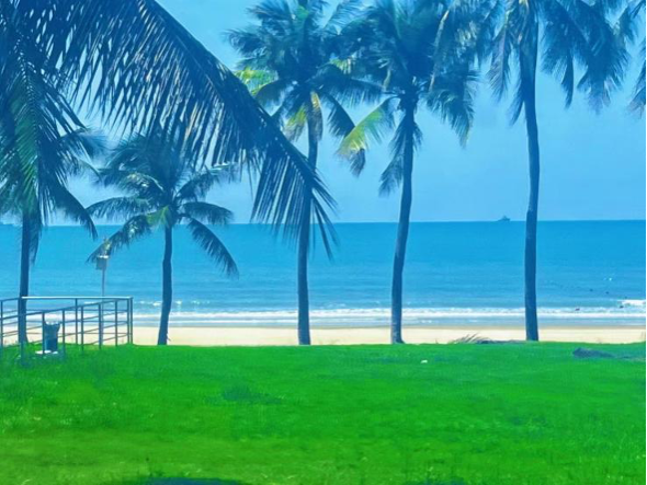 11点半所有队员集结完毕,坐大巴回酒店,在路上,大家感慨来三亚这么多天都没见过海,也没欣赏到这座城市闻名遐迩的美景,大家提议让司机载我们从沿海边的路线走,在车上望望海景。司机师傅没让我们失望,沿途经过三亚湾海岸线,海面中央停了几艘轮船,白浪打着沙滩,激起无数浪花,岸边的椰树与蓝天、白云、海岸线相映衬,美不胜收。队友们纷纷拿出手机,隔着车窗玻璃,记录下眼前美丽的瞬间。