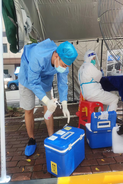 徐鑫辉同学:天刚亮,我们就出发了。信息采集、领取物资、搭帐篷、搬冰块、转运样本,我们充分诠释了“革命战士一块砖,哪里需要哪里搬”。一天的时间,完成了附近几个居民区五千人的核酸检测。工作结束,已经累得随时都能躺下睡着。虽然我们也只是做了一些微不足道的工作,但是我相信只要每个人有一份光,发一份热,没有什么障碍是不能克服的。