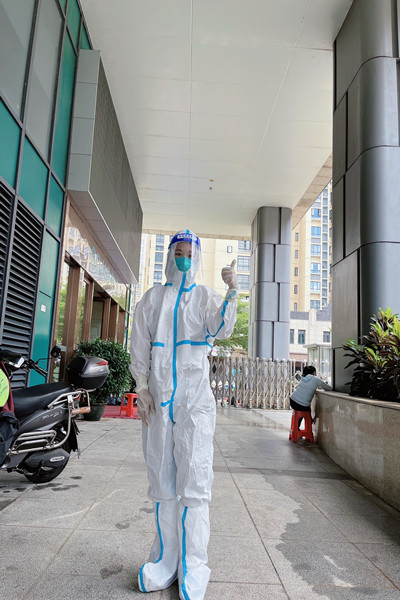 王菲菲同学:我的工作是信息录入。一开始我的心情是兴奋的,因为这是我第一次穿上“大白”的衣服,但随着工作强度逐渐加大,我的兴奋感也逐渐消退,更加感受到了抗疫前线医务人员们的艰苦和付出。戴上N95口罩让我呼吸不顺畅;穿上密闭不透风的防护服后汗如雨下,过不了多久衣服已经湿透了;戴上手套,再加上炎热的天气,让我的手在汗水中泡肿了……由于防护服是一次性的,粘上胶带之后不能喝水,更不能上厕所,除此之外还要克服闷热感,连续在三十多度的户外忙碌四五个小时,这份工作远比我想象中的要辛苦很多很多。一天当中断断续续下了几次大雨,可是我们的工作从未间断,即使刮风下雨也不能阻止大家战胜疫情的决心,这就是中国人!在面对疫情时,全国人民齐心协力抗击疫情的决心是一致的,我相信,在这场抗疫斗争中我们一定能取得决定性的胜利。