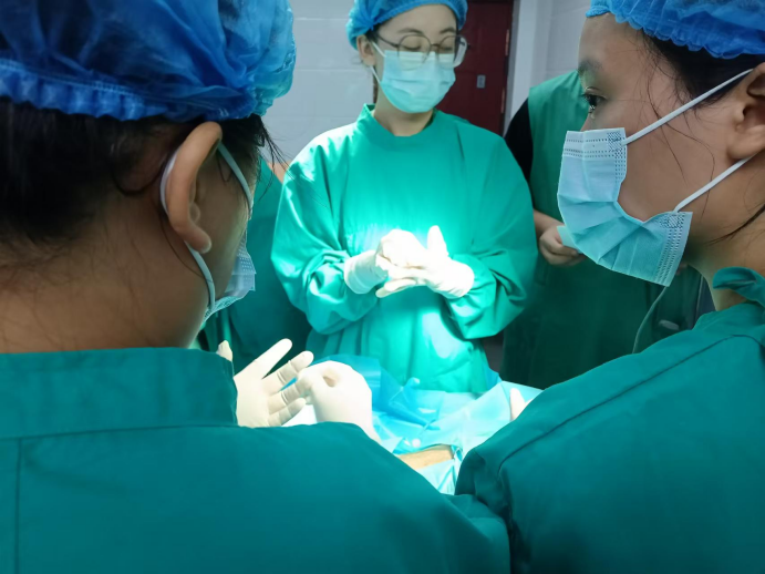 正式教学开始前一周,教研室对不同专业的学生分组并分配角色,每7名同学一组,每组包含4名临床学生、2名护理学生及1名麻醉学生,分别担任第一主刀、第二主刀(轮换)、第一助手、第二助手、器械护士、巡回护士及麻醉师。要求学生们在智慧树观看手术视频,提前熟悉手术流程,巩固练习各项外科基本操作技术。
