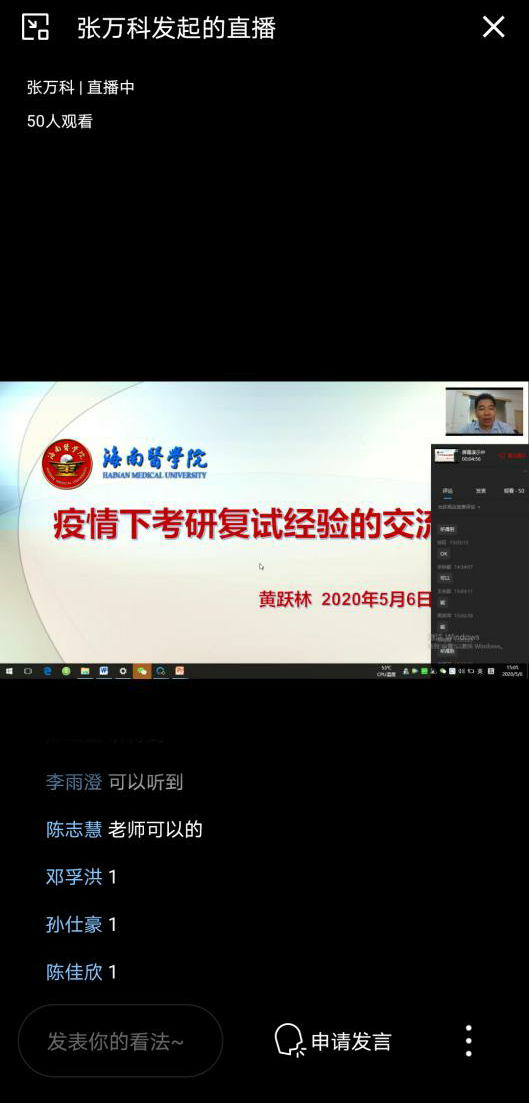 为帮助学生了解更多疫情下的考研复试信息,做好考试准备,提高复试上线率,在第一临床学院张万科副书记推动和组织下,5月6日下午15:00,我院通过网络直播成功召开了面向2020届考研和2019届二次考研学生的“疫情下考研复试经验交流会”。本次交流会由taptap点点招生与就业指导处副处长黄跃林老师主持,超过100名同学参与观看。会上,黄老师积极地为同学们解疑答惑,交流并分享疫情下考研复试形势与对策。