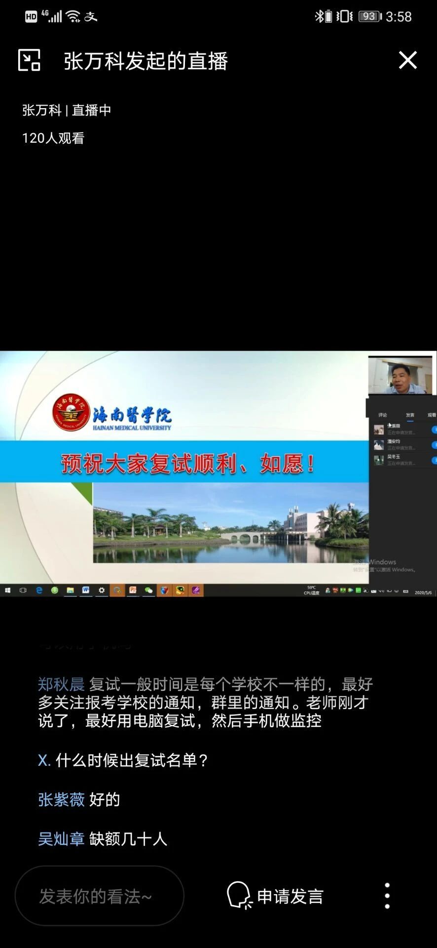 随后,同学们以发言和评论的方式,就高校复试方式、准备材料及面试技巧等疑惑进行提问,黄老师均给予耐心的解答。最后,黄老师表达了对同学们考研复试成功的美好祝愿,并鼓励大家积极准备。