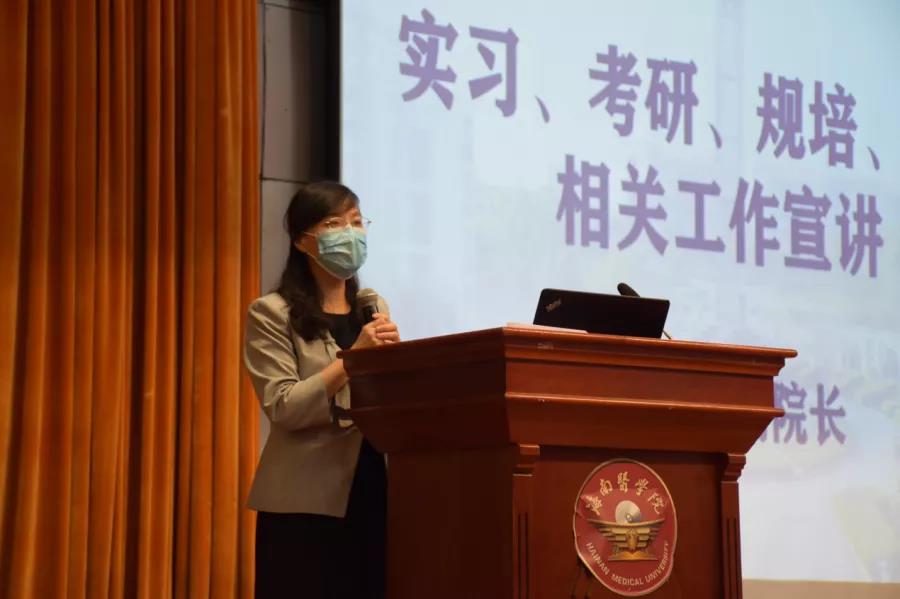大会第一项,姚晨姣副院长就实习、考研、规培和执医的相关工作进行宣讲。姚院长讲述了实习与考研的重要性及其之间的关系,强调实习生要有正确的角色定位,把握好人生的每一阶段,同时,姚院长还给同学们讲解了规培和执医的相关注意事项和建议。