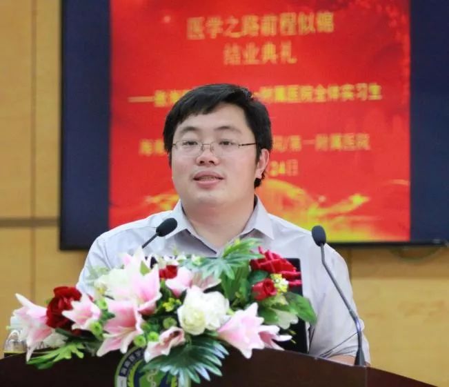 下午,“医学之路前程似锦”实习结业典礼如时召开。同学们安静有序地在《我和我的祖国》的序曲中,等待会议的召开。欢送典礼由第一临床学院于佳岐老师主持,在领导祝福寄语中开启,第一临床学院李其富副院长在会上,首先表达对同学们选择第一附属医院的感谢。希望同学们有所收获。他深情地说,对于医学生而言,一年的临床,将是一辈子印象深刻的岁月。经过入科教育、床旁带教、教学查房、小讲座、病例讨论,经历了轮科考试、出科考试,甚至经历了危重病人的抢救、甚至面对死亡。这一年,真实的临床,真实的病人,相信比校园更有收获。但是临床技能操作,还不够熟练;尤其是临床思维能力,还需要进一步的建立,希望在这即将结束的日子里,大家好好思考思考。最后他对同学们提出了要求和期望。希望同学们珍惜所剩不多的实习时间,尊重老师,认真实习;希望你们以人为本,敬畏生命,在漫长的从医之路,热爱祖国,恪守医德,救死扶伤,刻苦钻研,精益求精,全面发展。