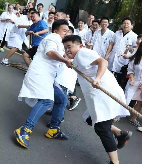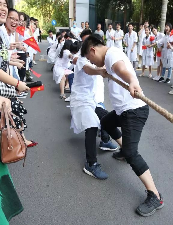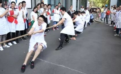 上午活动的第三个环节是“难舍难分师生情”拔河友谊比赛,比赛将活动再次推向高潮。比赛由一附院青年实习生及带教教师各15人组成,比赛过程,前面的活动让师生们心情澎湃,主动要求在师生赛前增加留学实习生与中国实习生的友谊赛。最终,中国实习生斗志昂扬,先后赢得了师生友谊赛、中外实习生友谊赛。现场气氛热烈,甚至患者家属都纷纷加入啦啦队,“加油!加油!”的声音响彻整个第一附属医院。整个活动在激昂澎湃且欢快的氛围中告一段落。