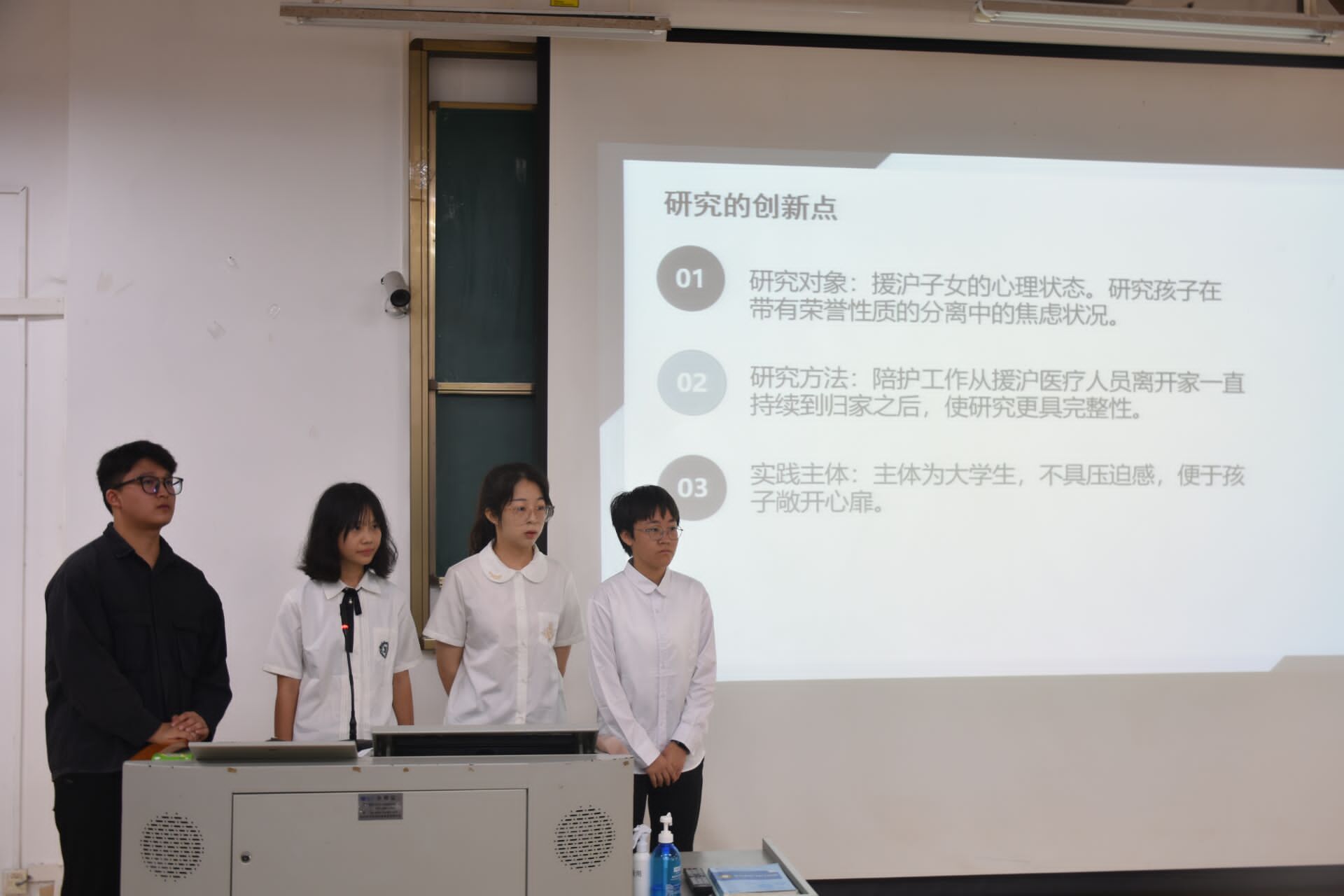 答辩会上,各个团队分别从项目概述、前期准备、阶段性安排、预期目标及成果等方面展开汇报,并由评委老师对项目进行批评指正和评分。其中对海南省东方市乡镇公共场所AED配置现状及市民认知度分析一组,体现了党中央对于居民基础医疗知识的普及理念;对海南省援沪医疗队队员的子女提供心理援助一组,体现了疫情当下,以人民为主的党的发展中心思想。