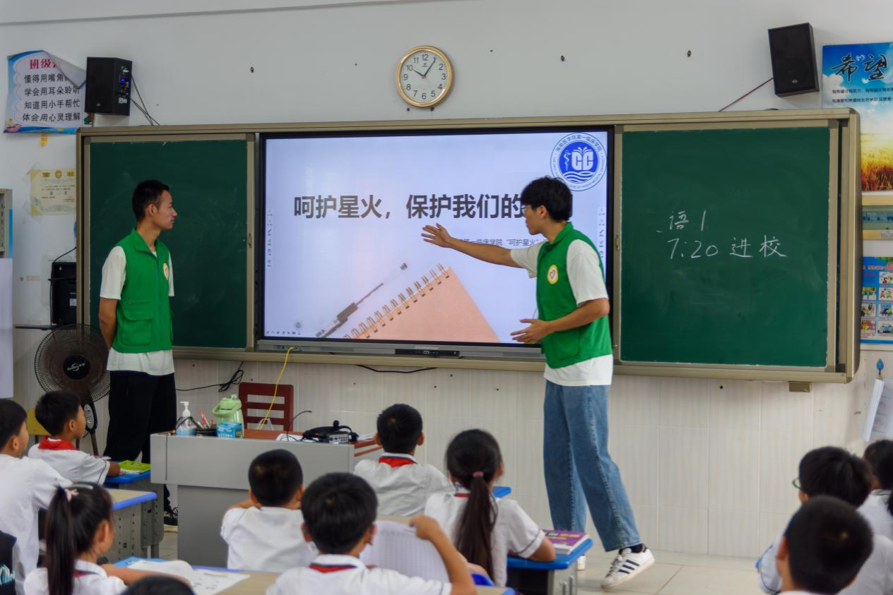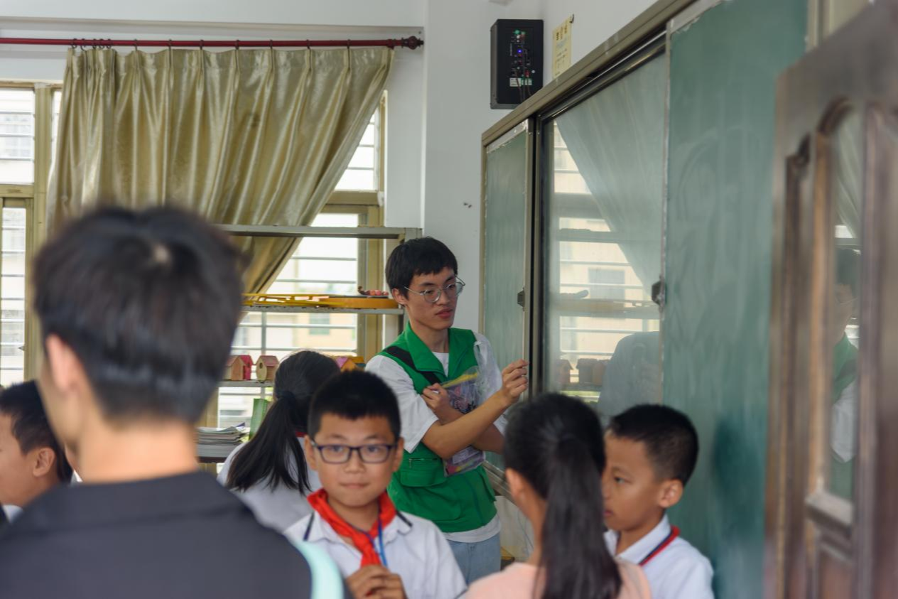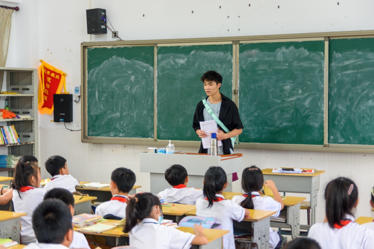 随后,调研队队长麦林对队员们强调了纪律问题,要求队员们避免影响小学正常的教学活动,同时再次向队员们确认各自的任务,确保调研活动高效有序地进行。随后调研队与东阁中心小学校长进行了交谈,与东阁中心小学教导主任进行了工作的交接。校长和教导主任对队员们的到来表示热烈欢迎,并非常感谢队员们能利用暑假的时间来到东阁中心小学进行科普活动,也感谢海南医学院举办此次三下乡活动。在办公室稍作休整之后,队员们来到东阁中心小学的三年级、六年级进行调查问卷的发放,同时积极为各个班级的同学们解答关于调查问卷中的问题,指导问卷的填写。