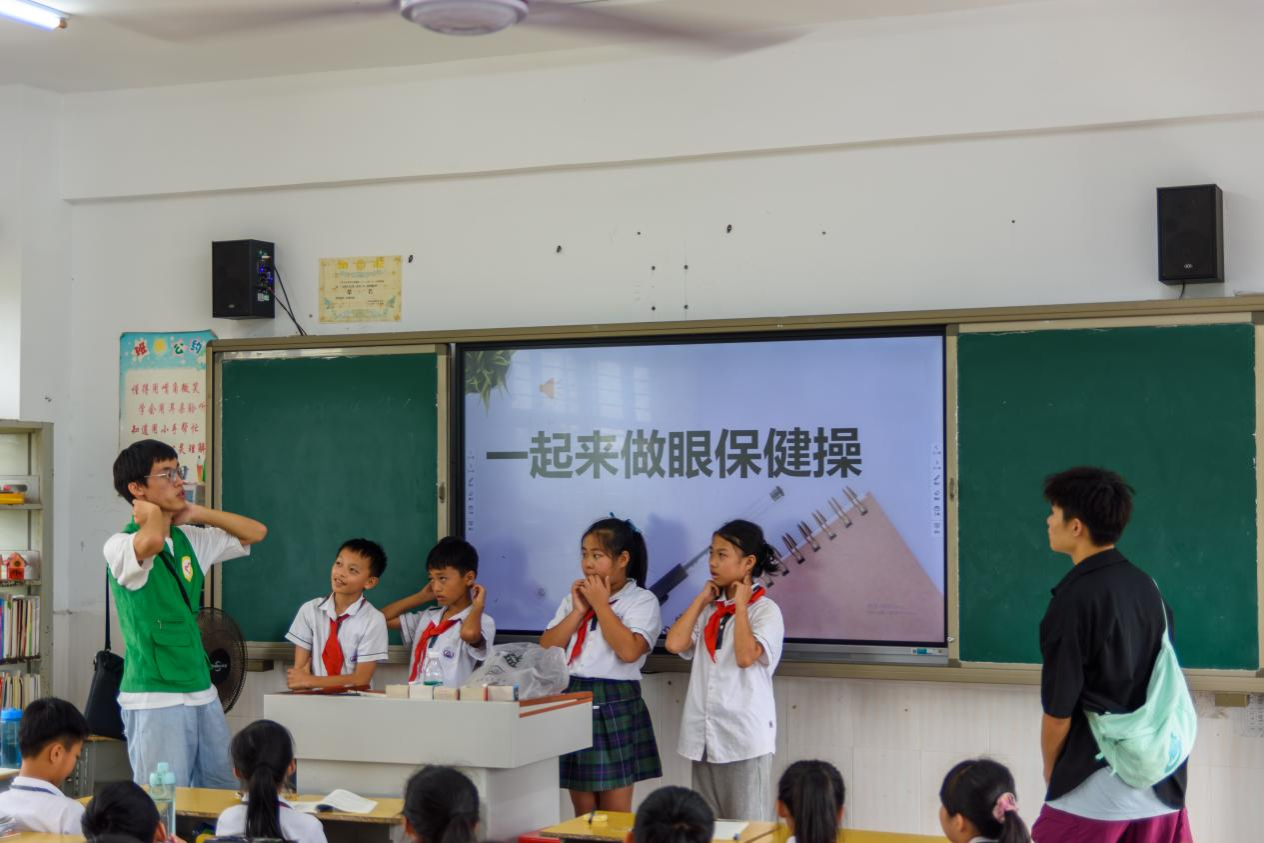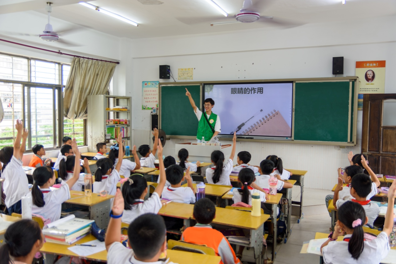 在完成了问卷调查工作之后,队员们向四年二班和五年一班的同学进行了主题名为“呵护星火,保护我们的光明”的科普宣讲。科普宣讲受到了同学们的热烈欢迎,课堂氛围十分活跃,在回答问题环节孩子们频频举手,争先恐后地回答队员们的各个问题,而队员们向同学们赠送了小礼物。为了更好地让同学们了解保护眼睛的方法,课堂上还播放了眼保健操科普视频,并进行演示,确保同学们能够掌握眼保健操的规范用法,更好地保护自己的视力。