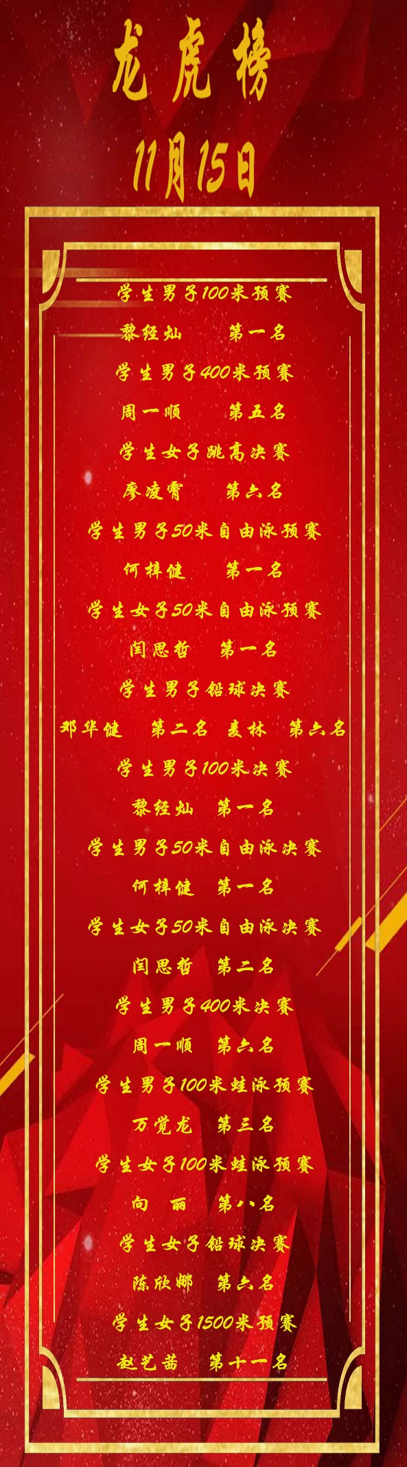 其中,值得关注的是学生男子100米、男子50米自由泳。我院黎经灿和何樟健同学取得决赛第一的佳绩。周一顺同学在男子400米决赛中获得第六名。此外,在田赛赛场上,邓华健,麦林夜在男子铅球决赛中分别获得了第二名、第六名的优异成绩。