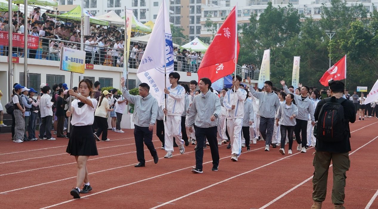 上午八时,开幕式正式开始。在激昂的运动员进行曲中,国旗护卫队迈着整齐有力的步伐,护卫着五星红旗入场,紧随其后的是校旗队和彩旗队,彩旗飘扬,蔚为壮观。之后,在一临床的方队中,老师和运动员们同样以气宇轩昂的面貌展现出我院团结一致、踔厉奋发的精神。