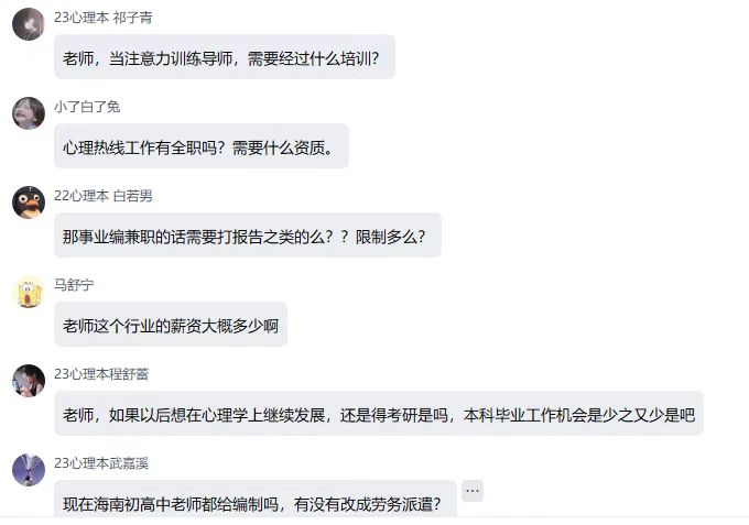 2009级毕业生田红梅分享了多元化的就业经验,包括上海家庭教育心理干预、机构心理咨询等实战经历。她建议同学们关注“教师招聘信息网”等公众号以便获取求职资讯,并强调国央企培训岗对心理学人才的需求。针对本科直接就业的困境,她则建议通过考取相关资格证书、参与心理热线服务拓宽选择面,同时仍推荐大家通过考研提升竞争力。