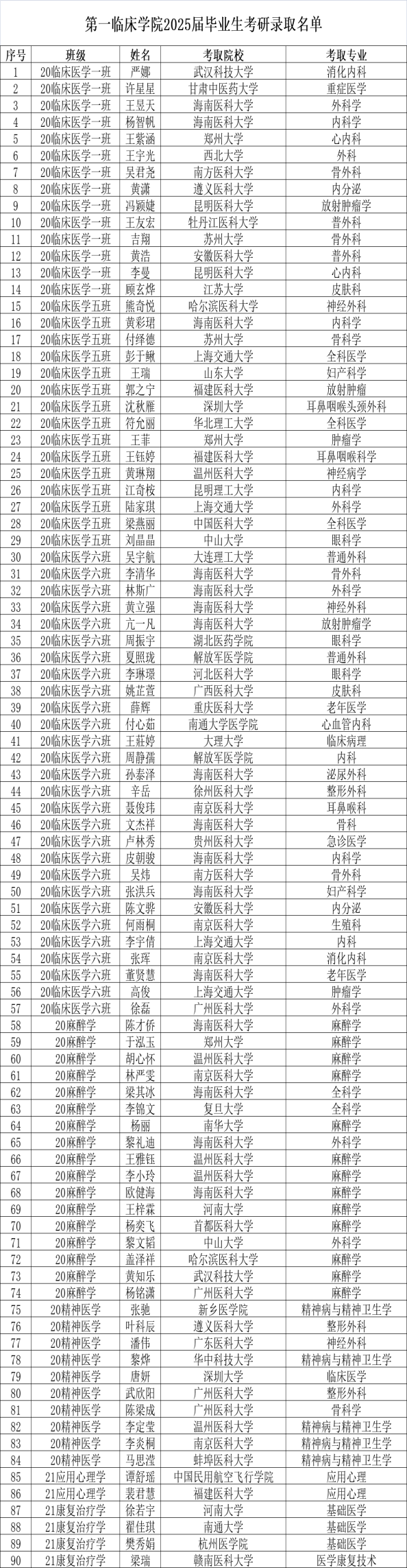披星戴月走过的路,终将繁华遍地。今年我院共有90位优秀学子成功考研上岸,这不仅是他们个人的高光时刻,更是taptap点点官网第一临床医学院的骄傲与荣光。我们衷心祝贺所有成功考取研究生的毕业生们,愿他们在新的学术殿堂里继续砥砺前行,勇攀学术高峰!同时,也希望在校的学弟学妹们能以他们为榜样,汲取奋进力量,在未来的考研之路上披荆斩棘,创造属于自己的优异成绩!以下是2025届毕业生的考取情况以及他们对学弟学妹们的暖心寄语。