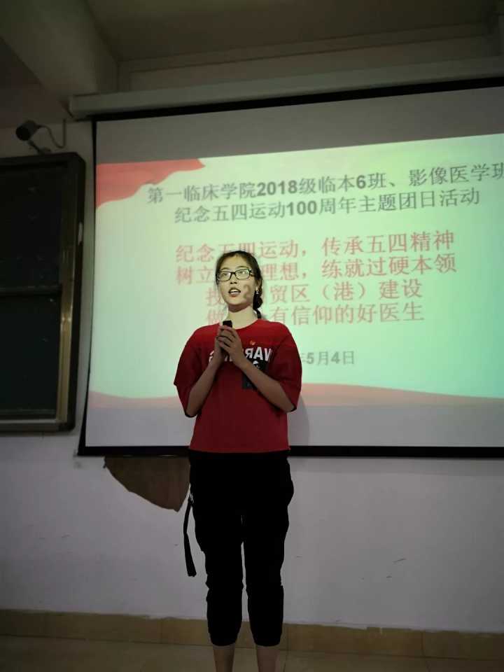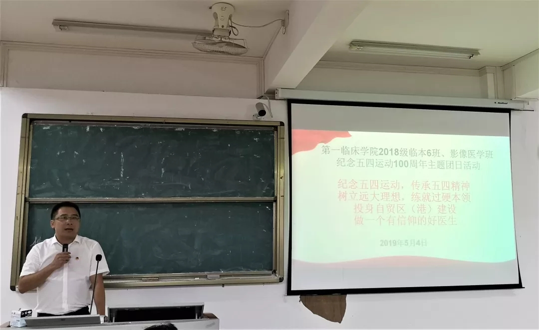 5月4日晚,在第一临床学院党委指导下,2018级临床本科6班团支部、影像本科班团支部联合举办的“青春心向党·奋斗新时代”特别主题团日活动在学校城西校区第四教学楼开展。活动由18影像本科班班主任雷浩泽老师主持,第一临床学院党委张万科副书记、18临本6班班主任陈磊老师、辅导员张延楠老师、林国天老师和两个团支部全体青年团员参加了本次主题团日活动。此次主题团日以“庆祝新中国成立70周年、纪念五四运动100周年,认真学习贯彻习总书记在‘纪念五四运动100周年大会’上的重要讲话精神,大力弘扬以爱国主义为核心的民族精神,不断增强广大青少年‘四个自信’为主题。