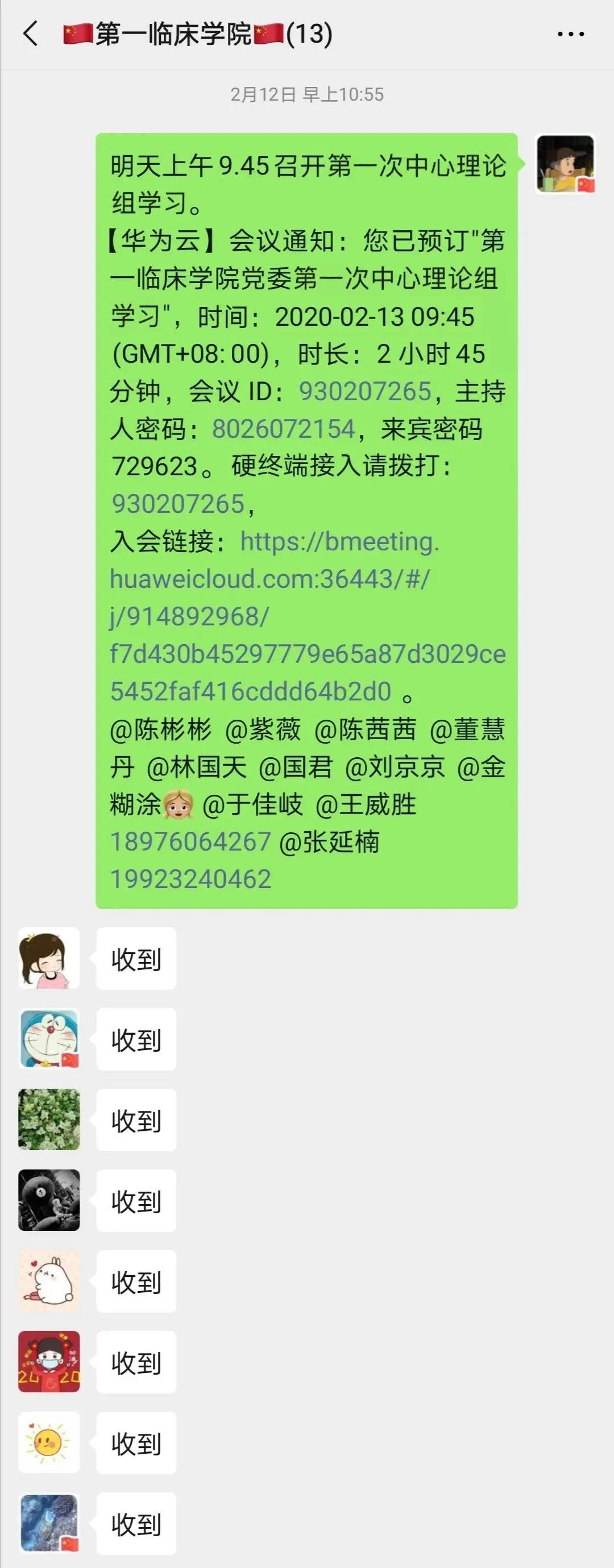2月13日,第一临床学院党委成员以网络视频会议的形式,召开了第一次中心理论组(扩大)学习会,党委委员和党支部书记参会,共同学习《中共中央关于坚持和完善中国特色社会主义制度 推进国家治理体系和治理能力现代化若干问题的决定》、《习近平:在“不忘初心、牢记使命”教育总结大会上的讲话》等文件。