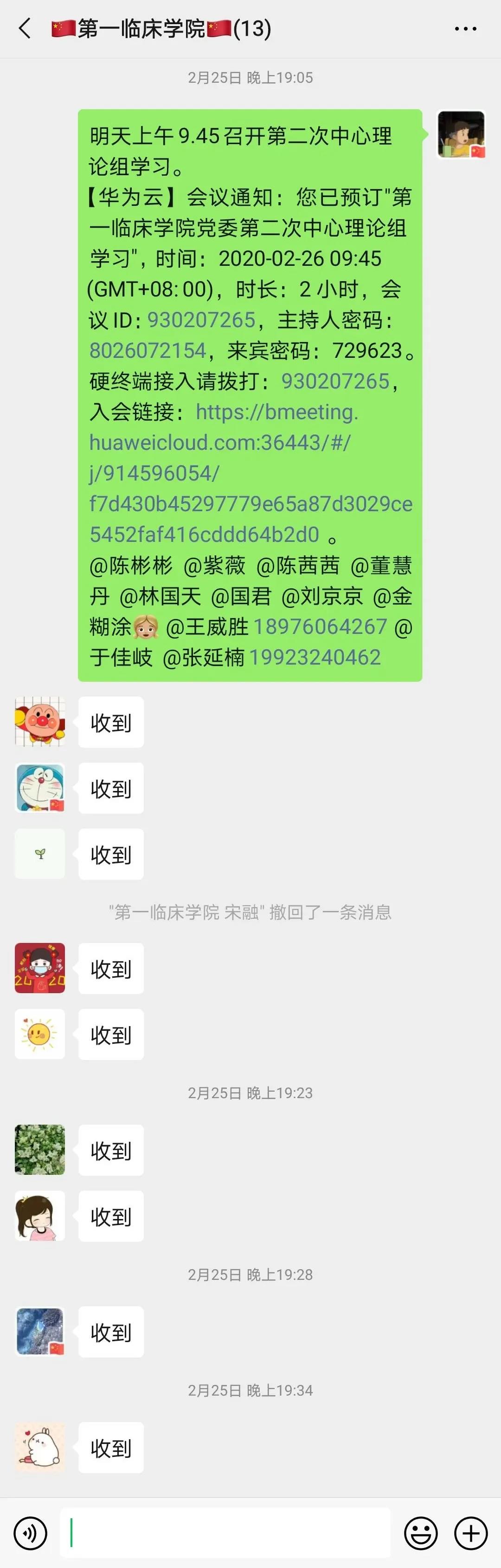 2月26日,第一临床学院党委成员以网络视频会议的形式,召开了第二次中心理论组(扩大)学习会,党委委员和党支部书记参会,共同学习了党的十九大报告、习近平总书记“4·13”重要讲话、对海南系列重要批示指示和中央12号文、疫情防控相关重要讲话、决策部署等相关文件。会后,每一名参会者根据会议内容,结合实际工作撰写了心得体会。