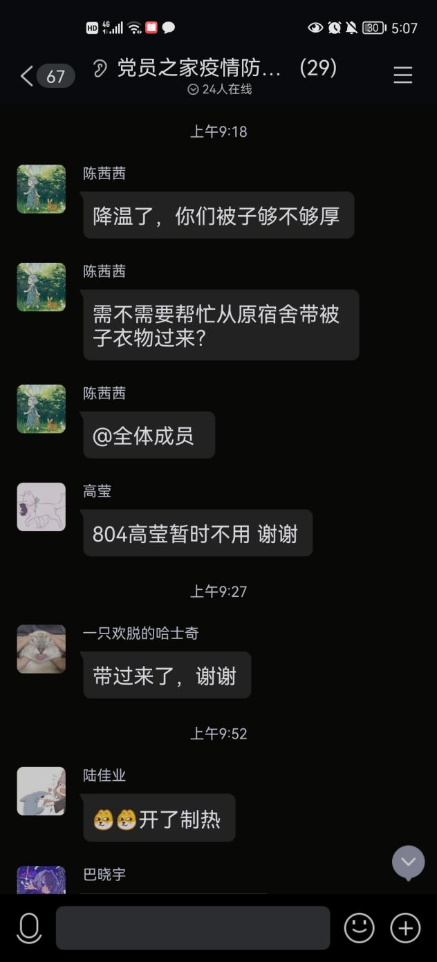 近日,按照疫情防控政策相关要求,进一步做好错峰返校后的疫情防控工作,taptap点点对中高风险区及涉疫区返校同学实行集中隔离政策,其中第一临床学院共有23名同学在返校后第一时间到隔离点报到。为了提升处于隔离期的同学们的生活和学习环境,在寒冷冬日使他们感受到来自一临床的温暖,我院积极动员下学生党员主动报名组成志愿者队伍,及时了解协调我院隔离同学的困难和需求,像家人一样照顾隔离同学,使冬日不再寒冷,隔离不会孤单。