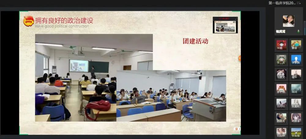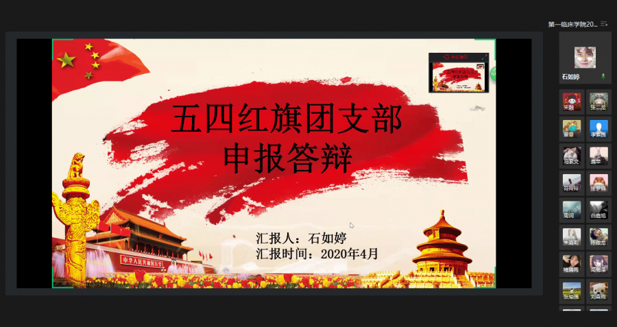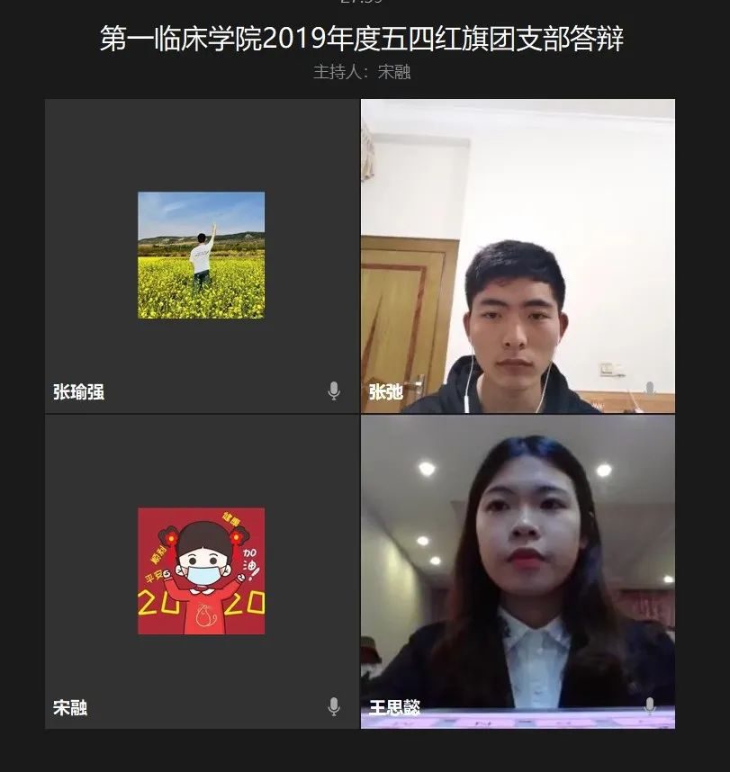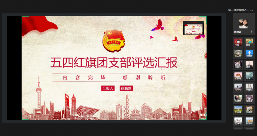 通过这次答辩,各支部不仅展示出一年来为支部建设做出的努力和取得的成果,也加深了对支部建设重要性的认识。同时,各团支部也看见了自身建设存在的不足,明确了下一步工作的重点和方向。在疫情背景下,通过“云答辩”的创新评优形式,充分展示了特殊时期第一临床学院广大基层团组织、团干部和团员青年勇当先锋、勇挑重担的青春风采。同时也有助于在全院青年中形成比、学、赶、超、帮的良好氛围,激发基层团组织的活力。相信各个团支部在今后的支部建设道路中,一定会走出他们自己的风采和特色!