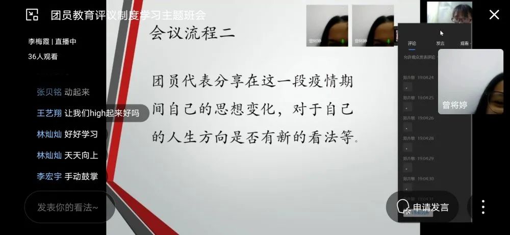 活动中,各班团支书与班内团员们进行视频通话,在通话过程中,团支书鼓励团员们积极发言,讲述自己疫情期间的思想动向。团员们在团支书的带动下纷纷畅所欲言,敞开心扉地交流。他们讲述了在疫情期间的苦闷、焦虑、害怕等情绪,并通过这种互诉的方式将内心的情感进行宣泄,释放了积攒在他们心里的压力和负面情绪。当然,也有很多团员始终保持着乐观的心态,虽然疫情给他们带来了生活和学习上的不便,但是大家的众志成城,也让这场疫情变得不再可怕。团支书认真地倾听并了解每一个团员的想法,将活动内容进行总结,并真诚地希望每位团员都能思想坚定,积极配合学校的工作安排。