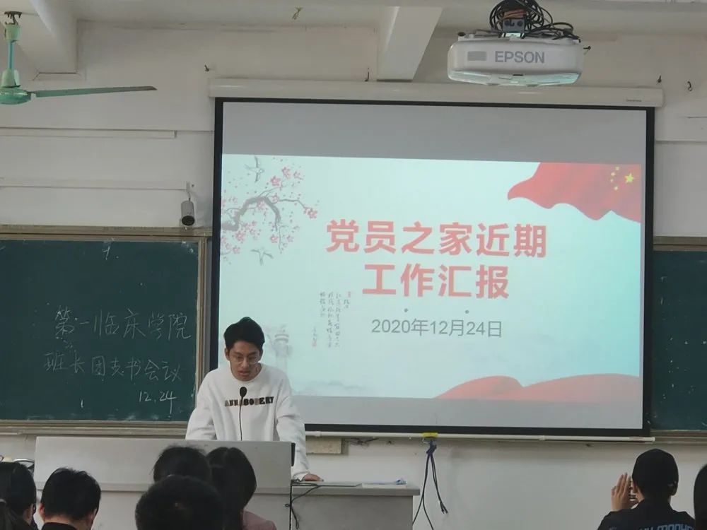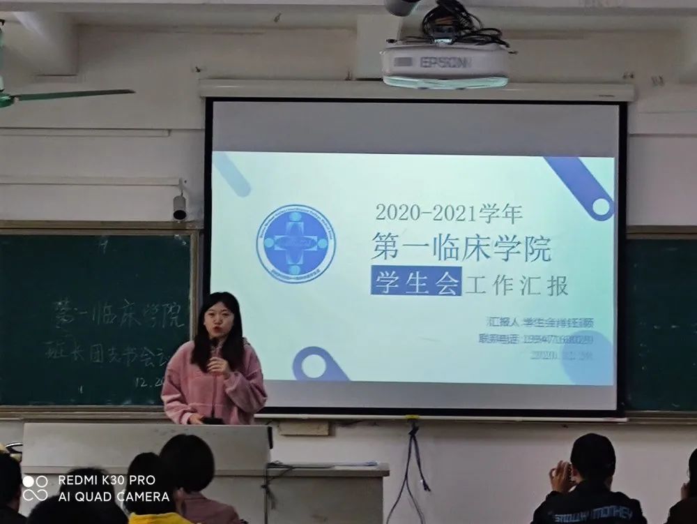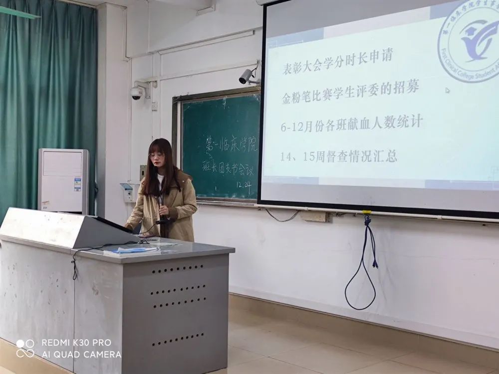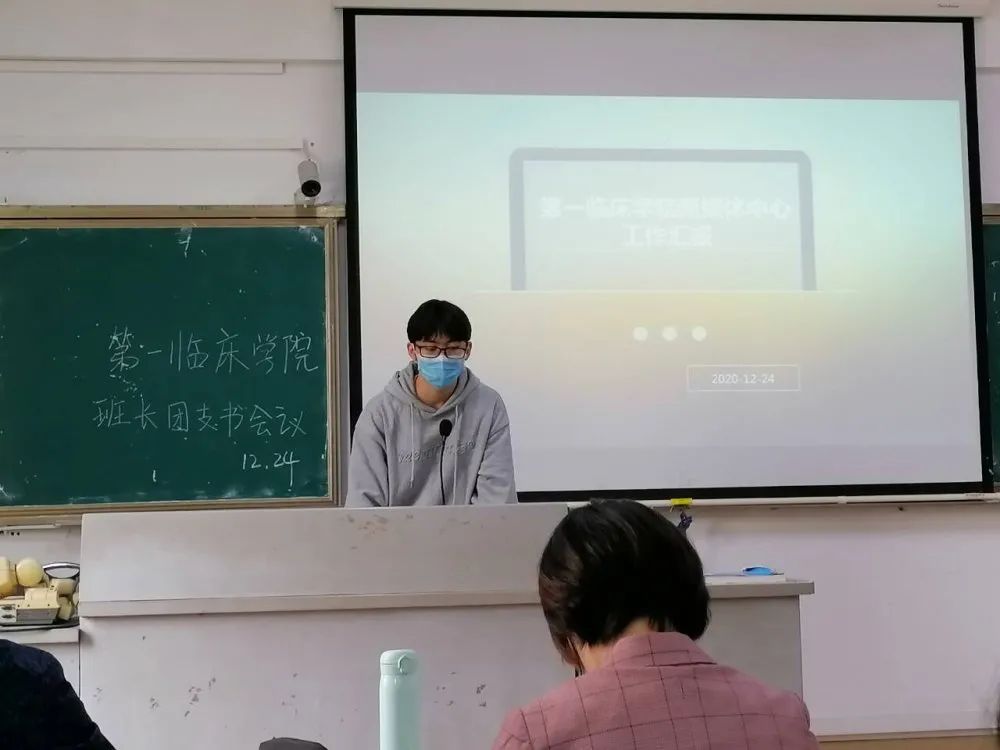首先由第一临床学院七大组织——行政事务中心、党员之家、青年志愿者协会、新媒体中心、学生会、科创中心和团委的负责人分别对近两周的工作做了详细地汇报、反馈工作中存在的问题并介绍了接下来的工作计划。其中行政事务中心主办的表彰大会圆满结束;团委向各班级反馈青年大学习截图上交不及时并且有部分班级参与率不达标等问题,应及时改进;入党积极分子和推优方面均做出部分调整,需要各班团支书与同学及时沟通交流。