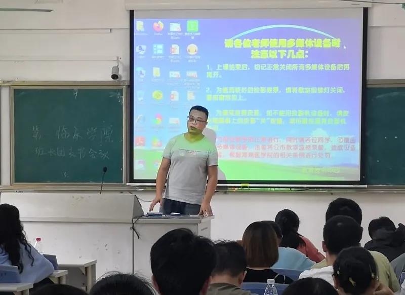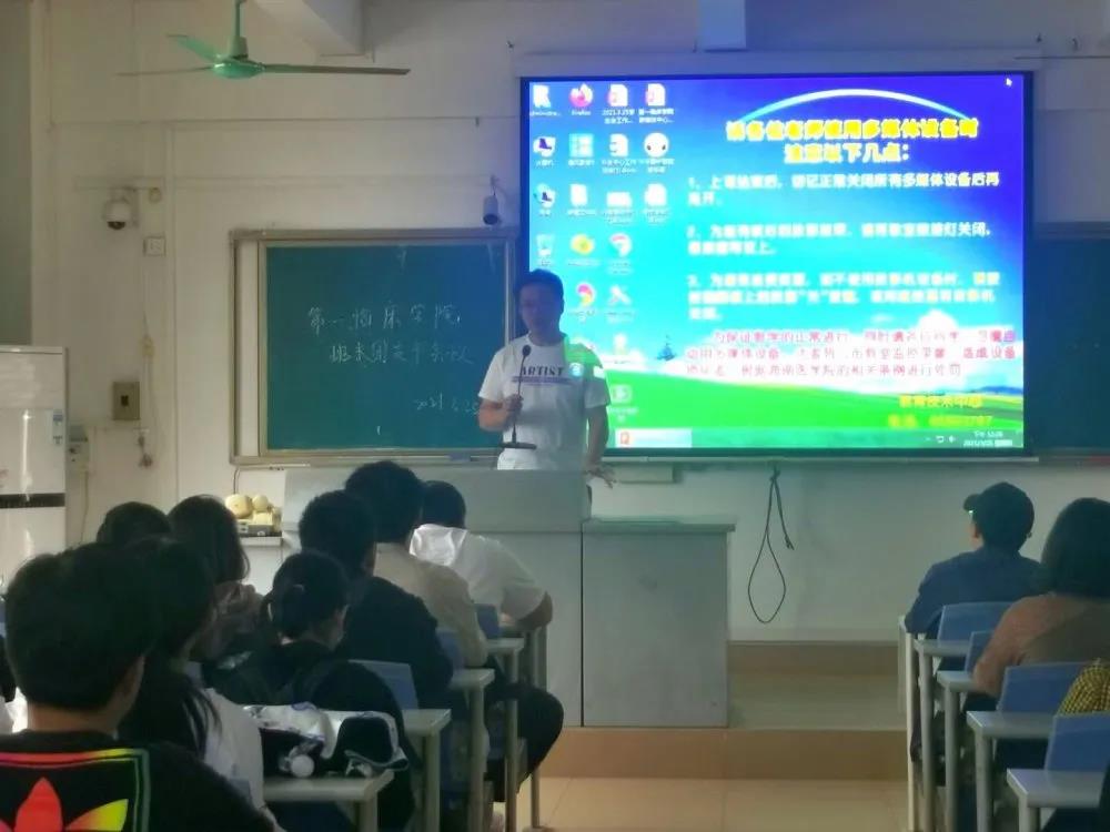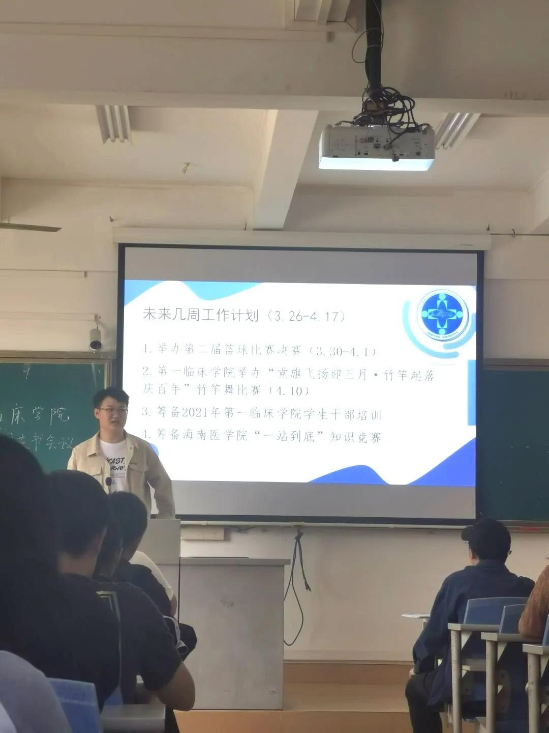 新学期初始阶段,在校领导和老师的指导下,学院各项工作顺利推进。为了总结经验并规划安排下一阶段学院的工作,于2022年3月25日中午12:10分,第一临床学院班长团支书会议在一教104准时召开。本次会议由第一临床学院行政事务中心方苏瑞部长主持,宋融老师、于佳岐老师、焦江博老师、我院各班班长和团支书及七大部门部分人员出席会议。