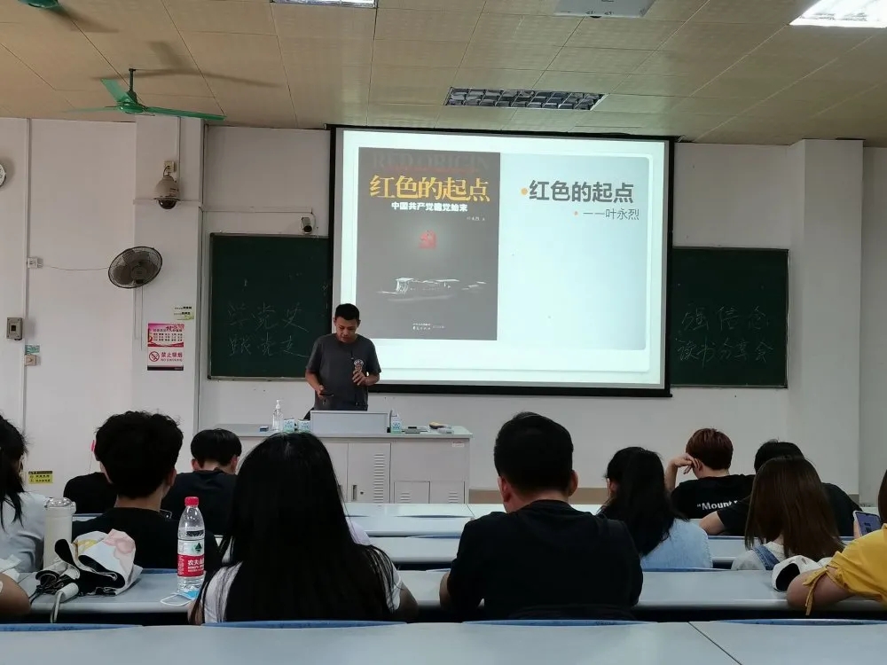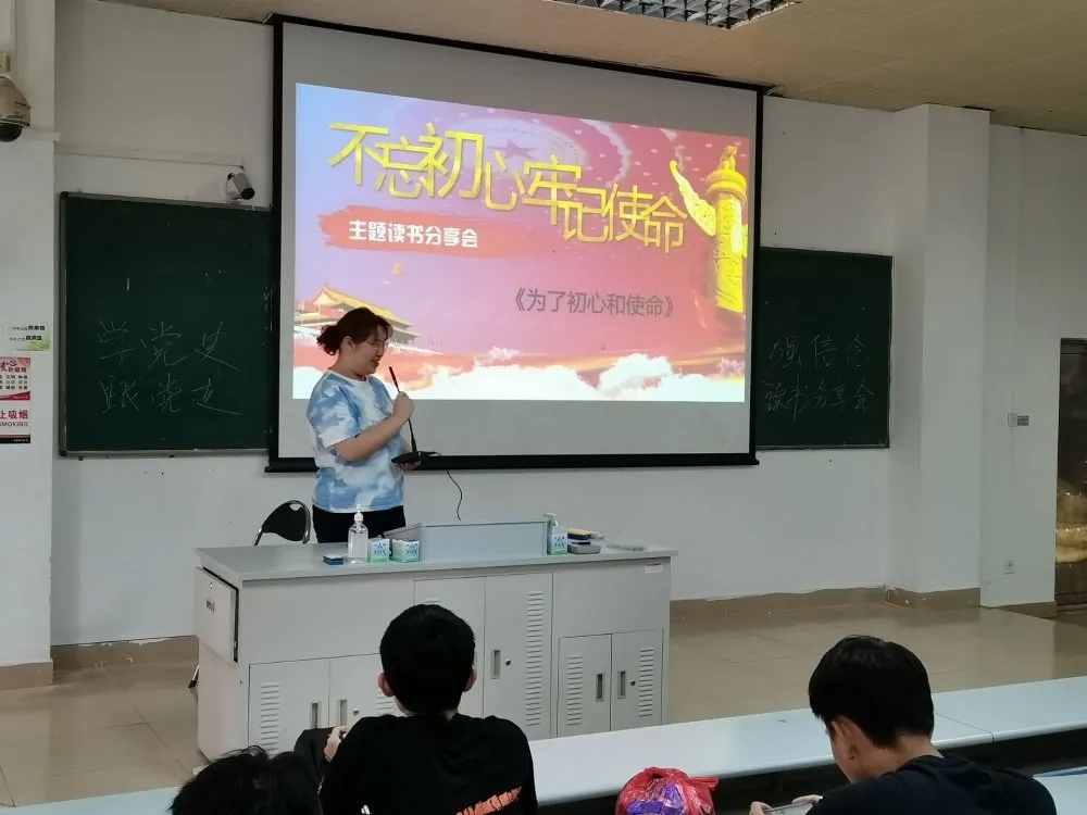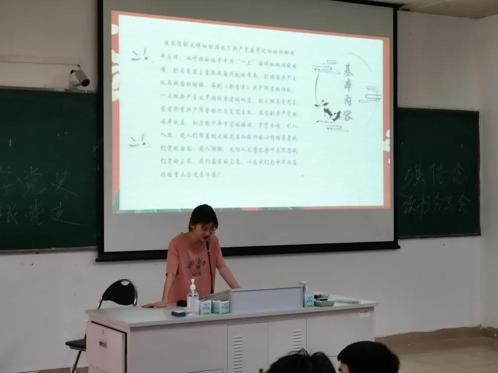 本次分享会在班级团支书张渝靖的主持下开始,此次分享会共有5个组,每组围绕“党史”主题选择阅读一本书籍并制作PPT展示分享。
