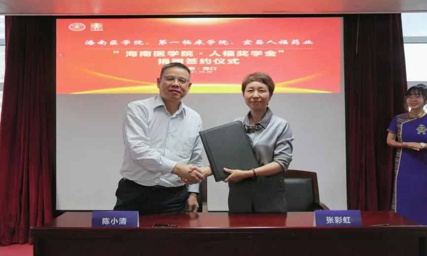 签约仪式由宜昌人福药业副总裁陈小清与海南医学院副校长张彩虹作为双方代表在协议书上签字,之后进行了捐赠仪式。