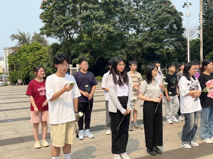 在班长的带领下全体同学排好队列,集体默哀后依次上前向烈士敬献鲜花,以此表达对革命先烈的缅怀追思。