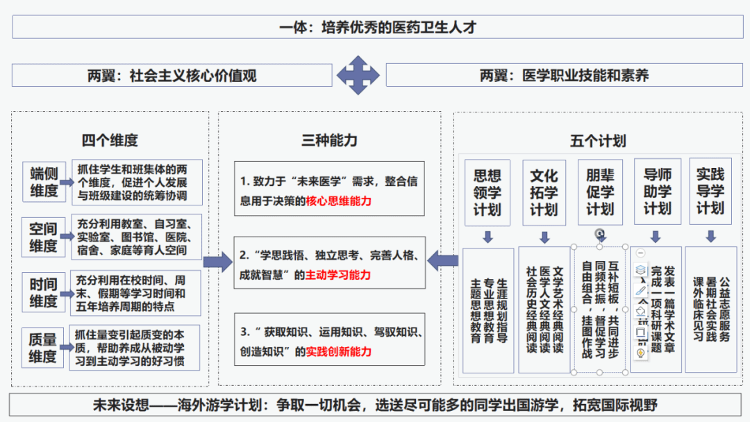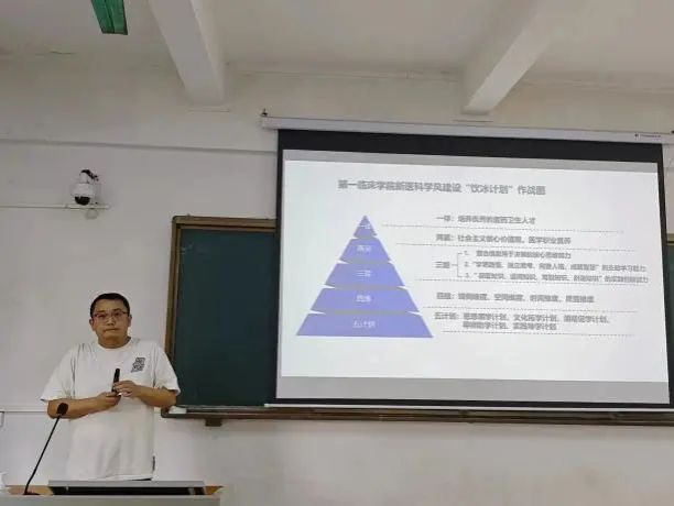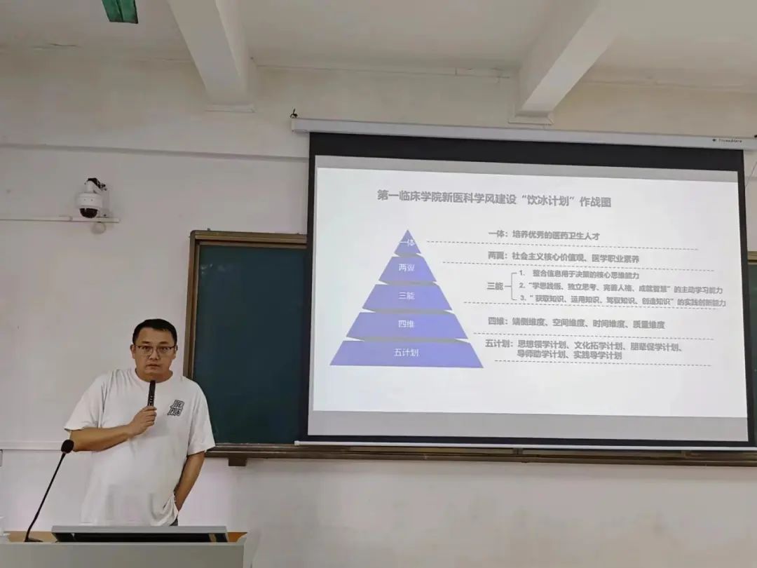 辅导员袁铁超老师、班主任陈磊老师向同学们传达了学校第四次党代会的基本情况和主要内容,介绍了学校未来五年的重点工作和主要任务,尤其是结合坚持立德树人,完善“卓越医学创新人才”培养体系,高质量培养时代新人,培养有温度、讲奉献的医学创新人才的目标要求,提出了有针对性的《新医科班级学风建设“饮冰计划”作战图》。陈磊老师为同学们介绍“饮冰计划”源自梁启超的《饮冰室文集》“十年饮冰,难凉热血”,更是结合陈国强校长所言“十年热血,愿倾天涯”。陈磊老师还强调“饮冰计划”具体体现为“一体两翼三能四维五计划”,旨在紧紧围绕培养优秀的医药卫生人才的核心任务,通过提升致力于“未来医学”需求的能力,为学校的发展作出更大的贡献。整合信息用于决策的核心思维能力、“学思践悟、独立思考、完善人格、成就智慧”的主动学习能力和“获取知识、运用知识、驾驭知识、创造知识”的实践创新能力,帮助学生具有良好的社会主义核心价值观、医学职业技能和素养。在这个过程中,除了认真完成课堂教学外,要紧紧抓住“端侧维度、空间维度、时间维度、质量维度”四个维度,统筹一切资源为学生成人成才服务。