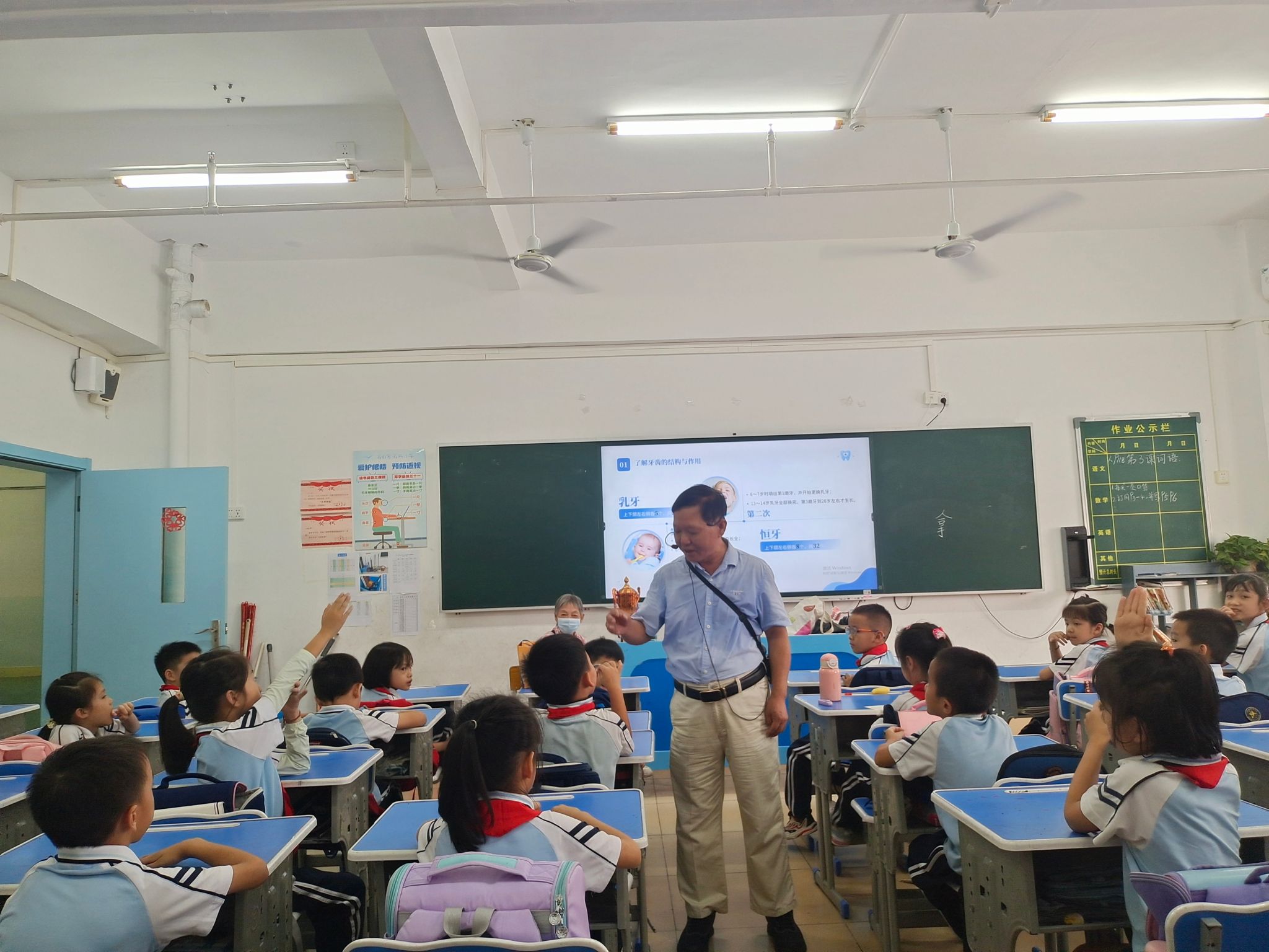 授课结束后,同学们热情高涨,争先恐后举手与服务队成员互动,咨询口腔健康问题。就同学们提出的问题,张教授耐心地一一解答。他表示,掌握口腔健康知识有必要意义,口腔健康直接影响全身健康,口腔防护更应从小做起。