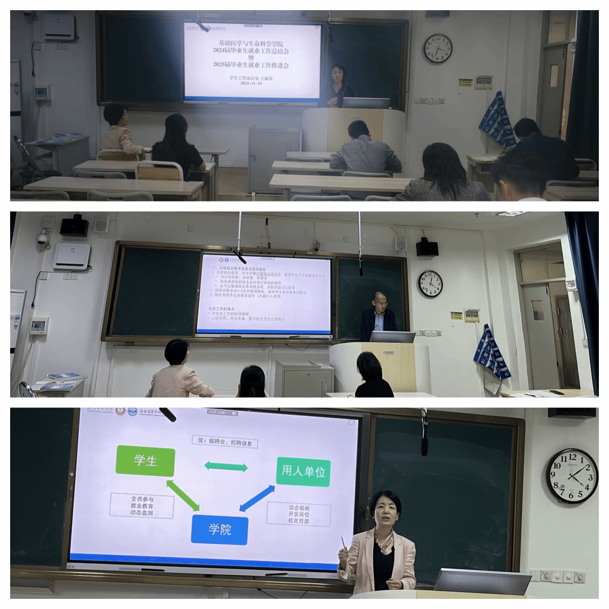 2024年11月19日下午,基础医学与生命科学学院于崇真楼603召开了2024届就业工作总结会暨2025届就业工作推进会,学院党委书记王晗,院长杨文君,副书记江朝娜,副院长杜冠魁,研究生导师,以及毕业班辅导员、班主任等学生工作相关人员参加了会议。
