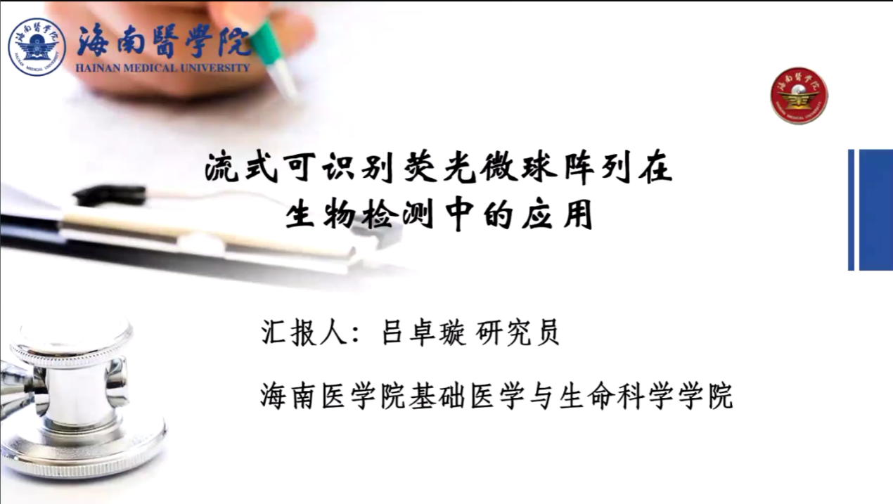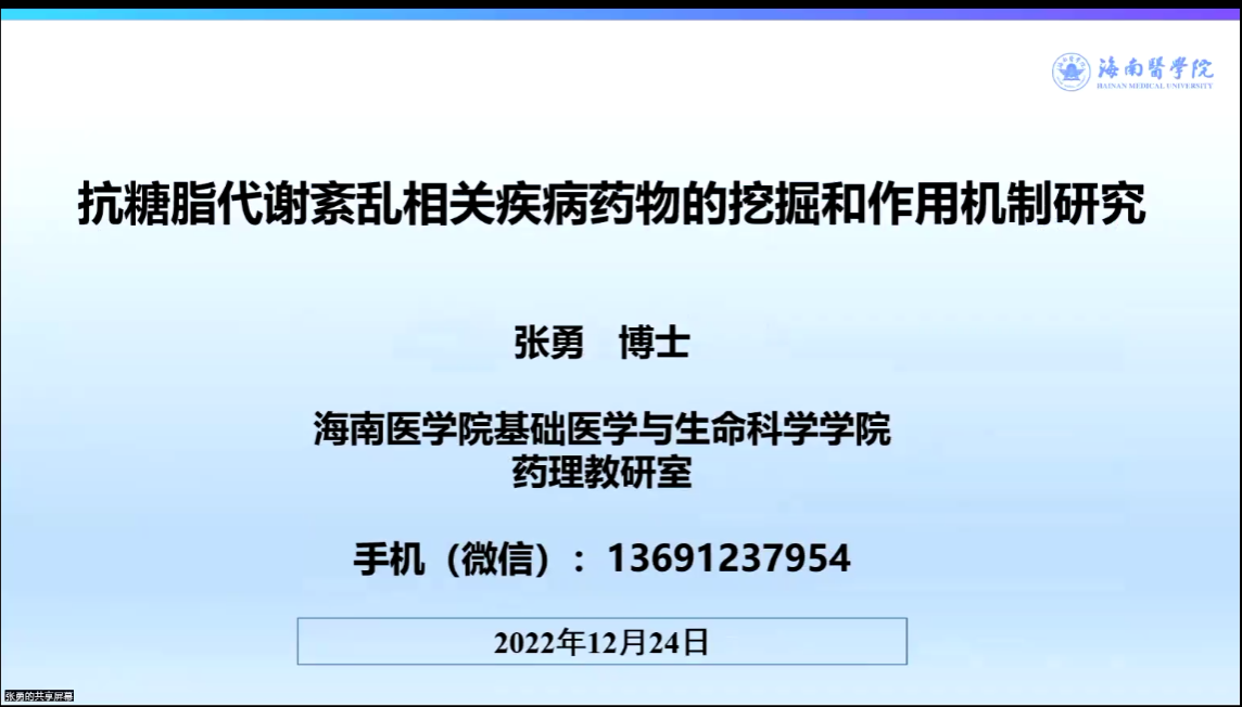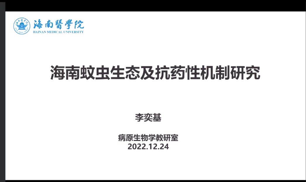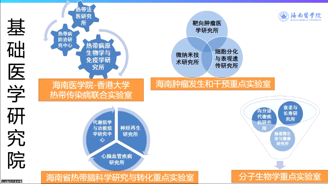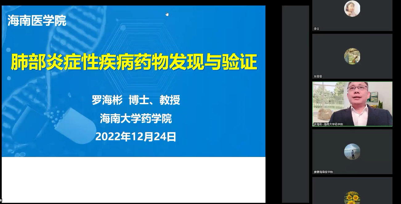会议邀请了海南大学药学院院长罗海彬做题为《新冠应急药物发现和验证》特邀线上报告。随后我院三家重点实验室科研人员做了进展报告,分别为海南医学院肿瘤发生与干预省重点实验室副研究员林波做题为《甲胎蛋白结合药物靶向肝癌细胞的研究》报告,海南省热带脑科学研究与转化重点实验室滕藤做题为《Molecular Guidance of Serotonin Raphe Neurons During Development》报告,海南医学院-香港大学热带传染病联合实验室做题为《海南蚊虫生态及抗药性机制》报告。