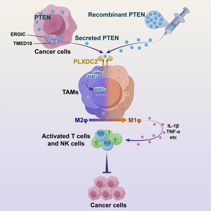 近日,我院陈国强教授与上海交通大学医学院肿瘤系统医学全国重点实验室沈少明研究员、张铖博士在国际顶尖学术刊物《Cell》子刊——《Developmental Cell》报道了题为“Secreted PTEN binds PLXDC2 on macrophages to drive antitumor immunity and tumor suppression”的合作研究成果。该研究揭示了PTEN可通过非经典蛋白分泌通路分泌到细胞外,并通过重编程肿瘤微环境中的巨噬细胞,实现抗肿瘤免疫的激活与肿瘤抑制。评审人高度评价该成果,指出该项研究“在揭示PTEN在动态肿瘤微环境中的复杂作用方面迈出了重要的一步,特别是它在癌症免疫治疗的应用。值得注意的是,这项研究揭示了PTEN和PLXDC2之间的一种全新的相互作用,阐明了以前未被挖掘的肿瘤内免疫调节机制。此外,该研究还显示PTEN能够加强抗PD -1治疗效应,强调了其临床应用前景。