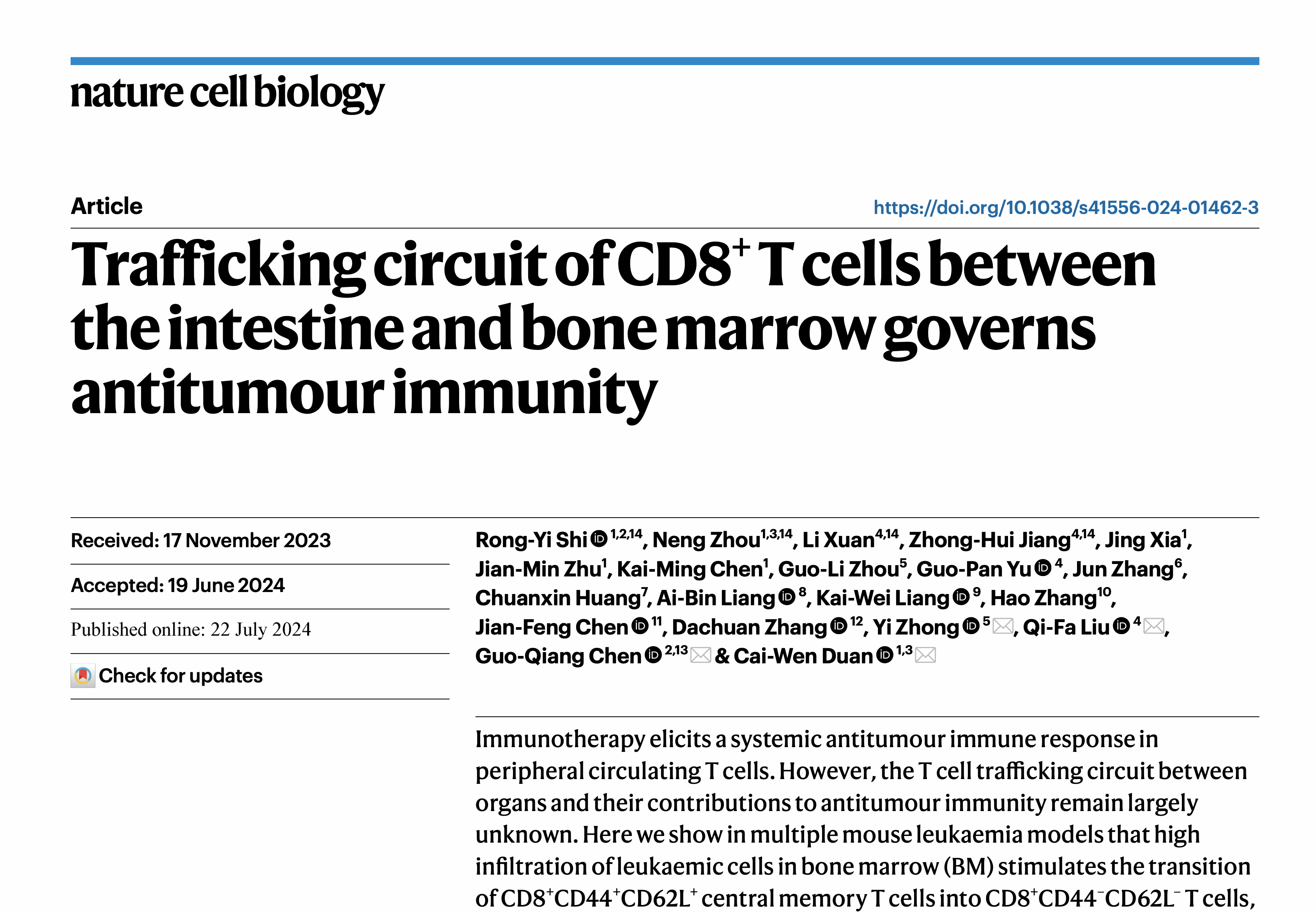 陈国强研究团队揭示CD8+ T细胞在小肠和骨髓间迁徙环路调控抗白血病免疫[2024, Nat Cell Biol.]