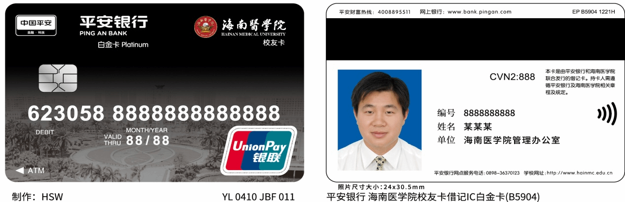 三、办卡流程:⑴各二级学院辅导员或校友分会老师签发申请;⑵校友办公室(图书馆821房)盖章;⑶平安银行柜台(和谐门对面马路)制卡,在卡片相对应的平安银行口袋银行APP已经有海南医学院校友标记,享受相关服务,卡片立等可取;⑷回来校内大学生活动中心激活校内功能。