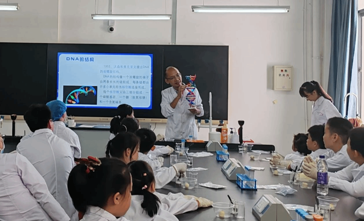 在活动中,王咸寿老师用风趣幽默的语言,从DNA的双螺旋结构入手,结合DNA模型的讲解,让小朋友们轻松理解什么是DNA。通过视频及图片的生动演示,逐步引导小朋友们了解DNA在细胞内的分布,以及其在遗传信息传递中的重要作用。