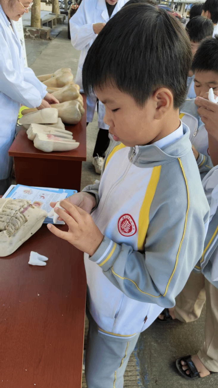 “爱牙小卫士”环节中,学生们分组开展口腔检查、正确刷牙演示及牙线使用比赛,在镇卫生院医生指导下学习巴氏刷牙法和牙线技巧;并用橡皮泥制作尖牙、切牙、磨牙模型,通过动手实践加深对牙齿结构的理解。