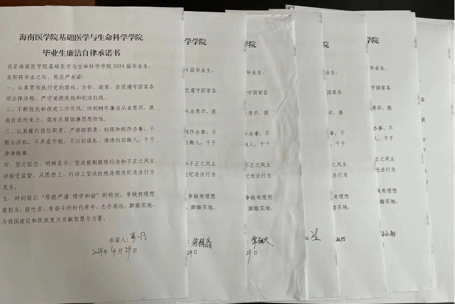 最后,全体毕业生签订了《基础医学与生命科学学院安全承诺书》与《基础医学与生命科学学院毕业生廉洁自律承诺书》,这既是一种行为规范,更是一份责任担当。