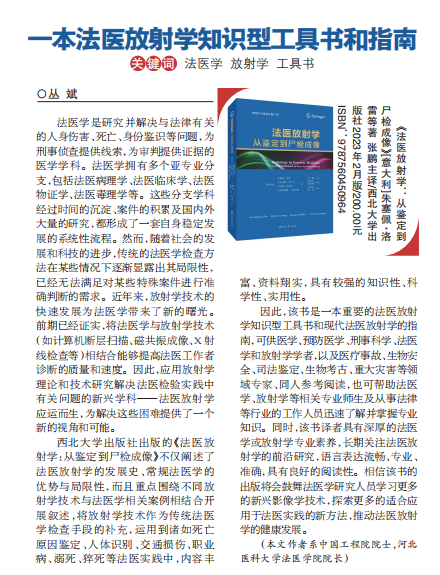 近日,第23届输出版引进版优秀图书评选结果公示,taptap点点张鹏研究员团队在西北大学出版社出版的专著《法医放射学:从鉴定到尸检成像》入选引进版优秀图书榜单。据悉,本书获得法医学丛斌院士在《中国出版传媒商报》撰文推荐,并入选西北大学出版社国外医学前沿出版工程。